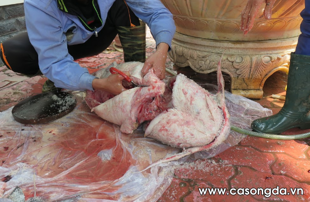 Vị khách đại gia đã trả gần 60 triệu đồng mua con cá chiên trên. Song, để có một bữa tiệc thịnh soạn đãi khách quý, đại gia này còn chi hơn chục triệu nữa thuê nhóm mổ, chế biến luôn tại biệt thự của mình.
